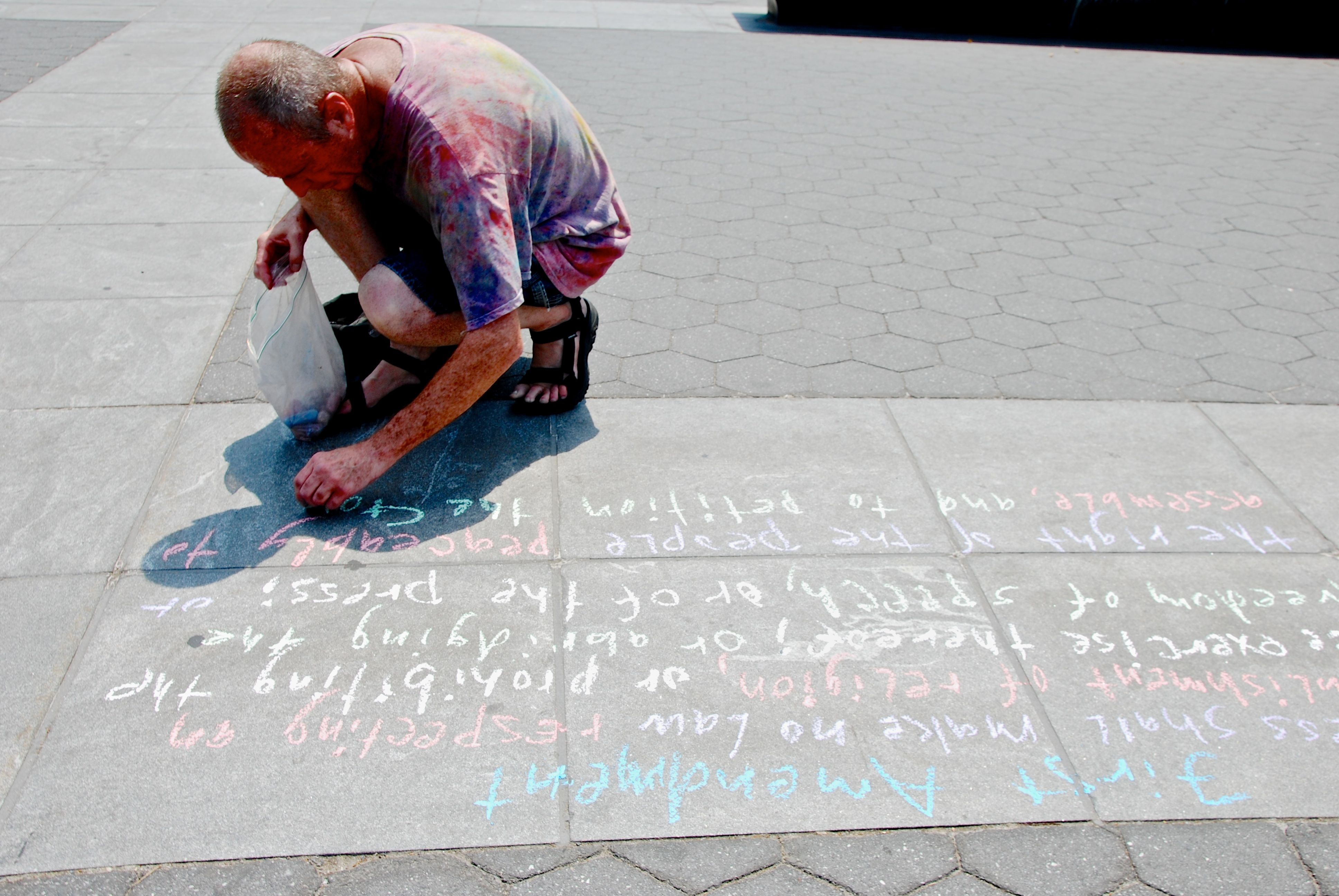 This is Stephen. He hangs out in Washington Square Park a lot writing out the first amendment. He said that he was almost been arrested multiple times for writing it at Union Square Park so now he stays at Washington Square Park. He believes our freedom of speech and religion are slowly desinigrating in this country. He said that, “Even the fact that I can’t write out the first amendment with chalk proves the point that my freedoms are being taken away. Kids can draw whatever they want but I can’t write the first amendment. There is something wrong with that.” The law enforcement at Union Square Park told him that he could be arrested for writing out ideological things, to which his response was, “Who even decides what is considered ideological? We all have different views about what that even means.”